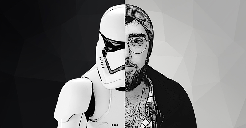 In my Portrayal, a descending line splits the portrait into two parts, me on one side, slightly cartoonified, and the Stormtrooper on the other side, we may look separate but we're two sides of the same coin, together we are whole.